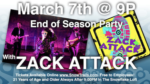 Sat. Mar. 7th 2026 9PM | Zack Attack | End of Season Party | $5 Admission |